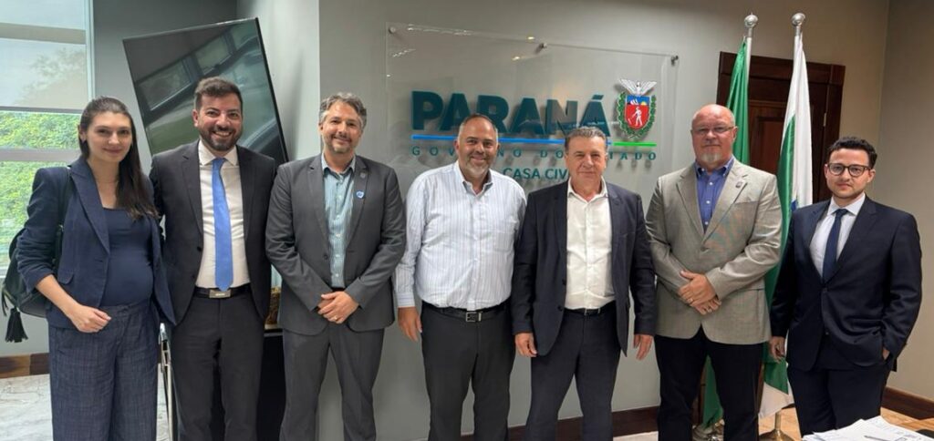 Representantes da APRE Florestas reuniram-se com o secretário-chefe da Casa Civil do Paraná, Carlos Ortega). O encontro foi realizado na Casa Civil, dentro do Palácio do Governo, e contou com a presença do presidente da APRE, Fabio Brun, do diretor executivo Ailson Loper, da assessora técnica Maria Lucia Siqueira e do assessor jurídico Gabriel Mantovani. Também participou da reunião o diretor-geral da Casa Civil, Maiquel Zimann.