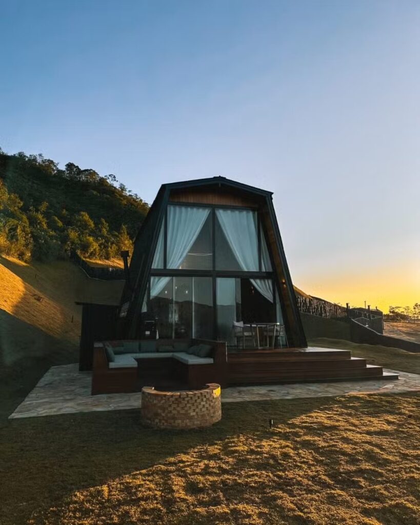 O chalé Scandinavian ficou em um ponto mais elevado, favorecendo a sensação de amplitude; enquanto o Double-Frame, primeiro com este design no Brasil, foi posicionado na parte mais baixa, tirando o máximo da vista da serra, através da abertura frontal.